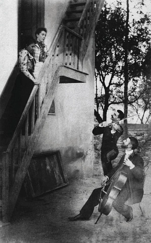Ο Παύλος (όρθιος) και ο Λέων Μελάς, με τις συζύγους τους Ναταλία και Ανδρομάχη το 1890, στην οικία της Κηφισιάς που ξεκίνησε ο αγώνας για την απελευθέρωση της Μακεδονίας
