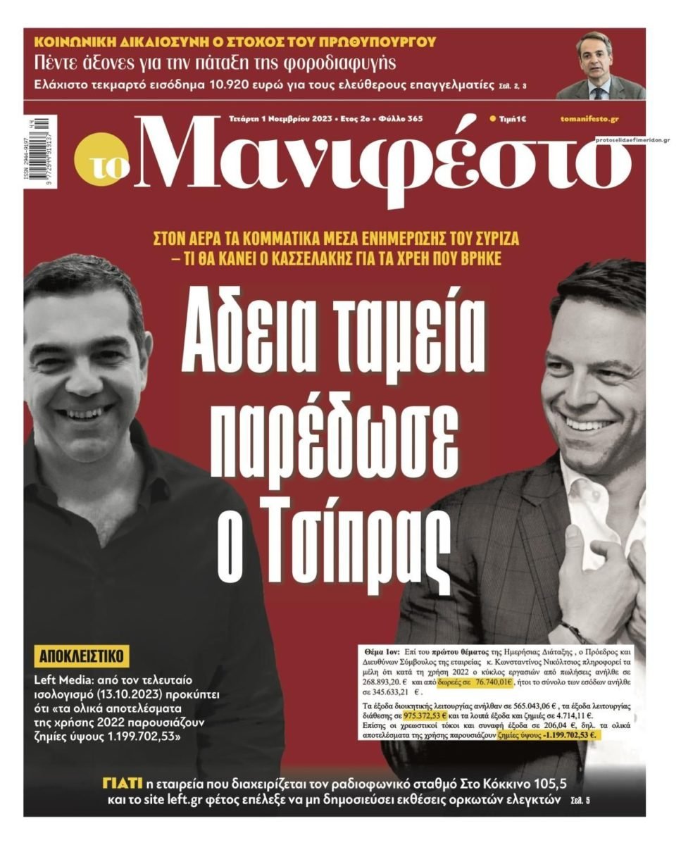 Χαρακτηριστικό το σημερινό πρωτοσέλιδο αλλά και το σχετικό διαδικτυακό άρθρο του Μανιφέστο με τίτλο «Άδεια ταμεία άφησε ο Τσίπρας – Ζητάει «λογαριασμό» ο Κασσελάκης» το οποίο ξεκινάει εισαγωγικά ως εξής: