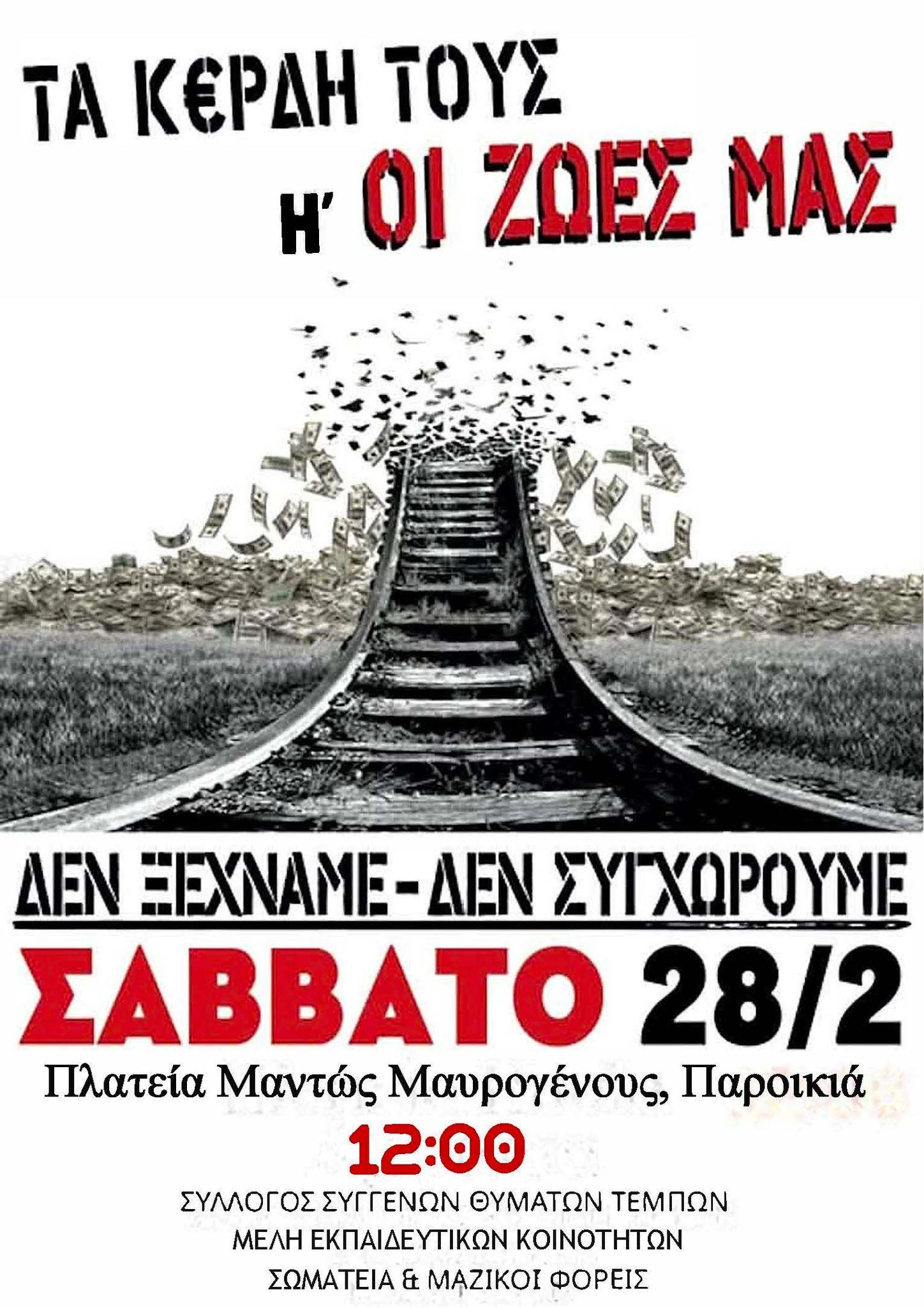 /Συγκέντρωση για το έγκλημα των Τεμπών διοργανώνει ο σύλλογος συγγενών θυμάτων, μέλη εκπαιδευτικών κοινοτήτων, σωματεία και μαζικοί φορείς στην πλατεία Μαντώς Μαυρογένους στην Παροικιά, το Σάββατο 28 Φεβρουαρίου, στις 12 το μεσημέρι.