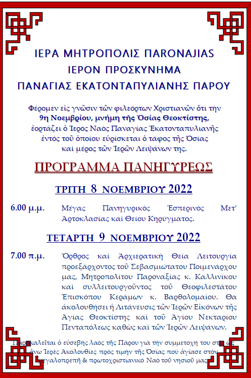 November 04, 2022 Εορτή της Πολιούχου της Πάρου, Οσίας Θεοκτίστης November 04, 2022/ fileleutheros.net View fullsize